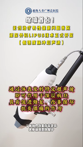 我院泌尿外科现已正式引进增城地区首批两台低强度脉冲超声波(LIPUS)无创治疗设备并常规开展慢性前列腺炎、勃起功能障碍等治疗,标志着男科疾病诊疗迈入精准化、无创化的新阶段。